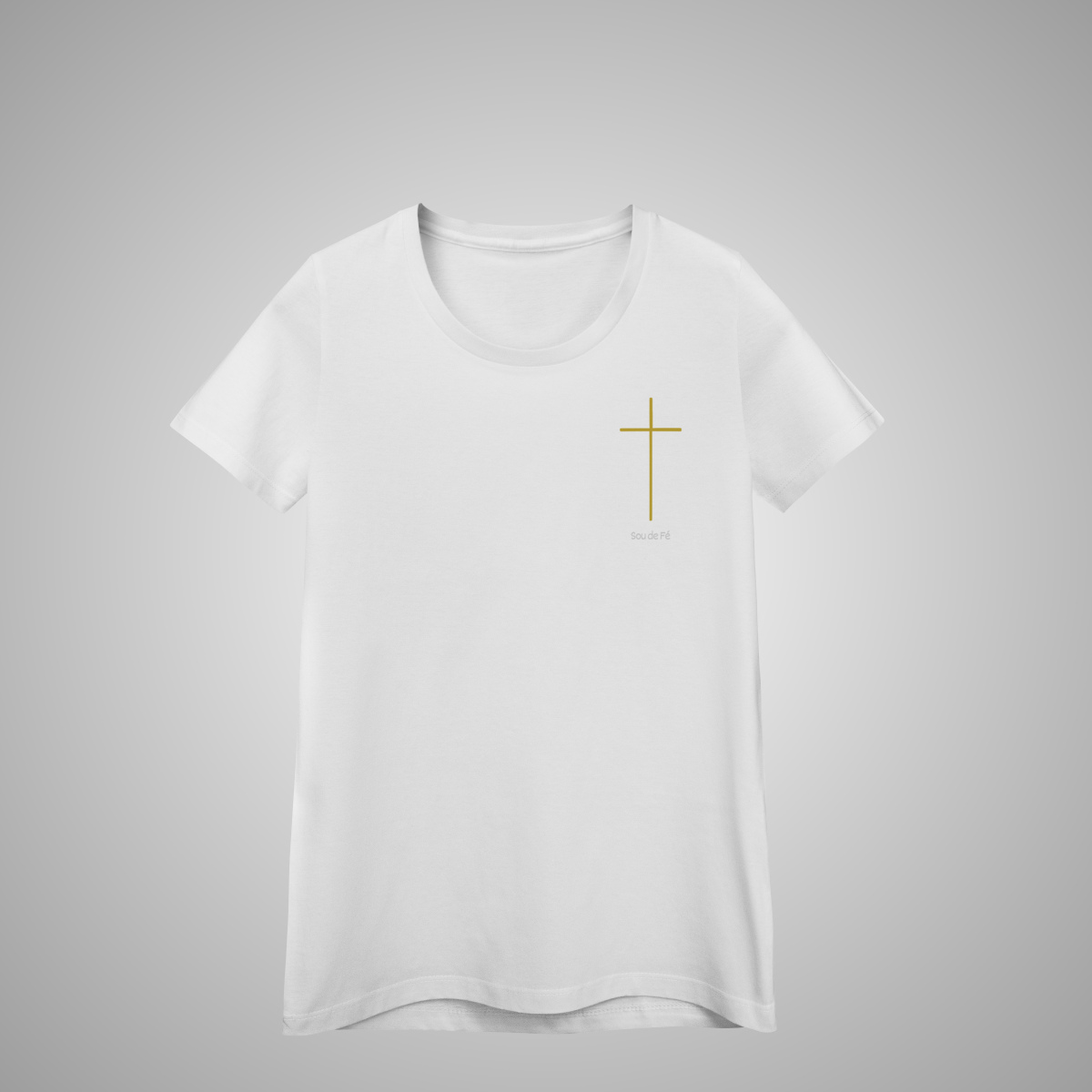 T-shirt feminina, com cruz minimalista dourada bordada no lado esquerdo do peito. Um design essencial da Sou de Fé, que traduz fé e simplicidade em uma peça atemporal.