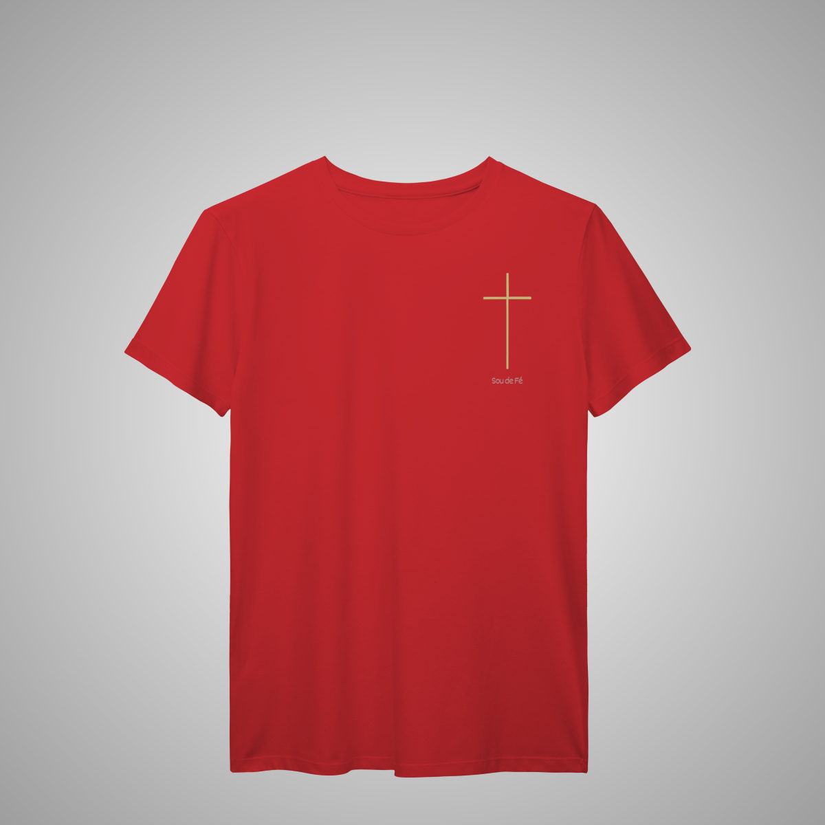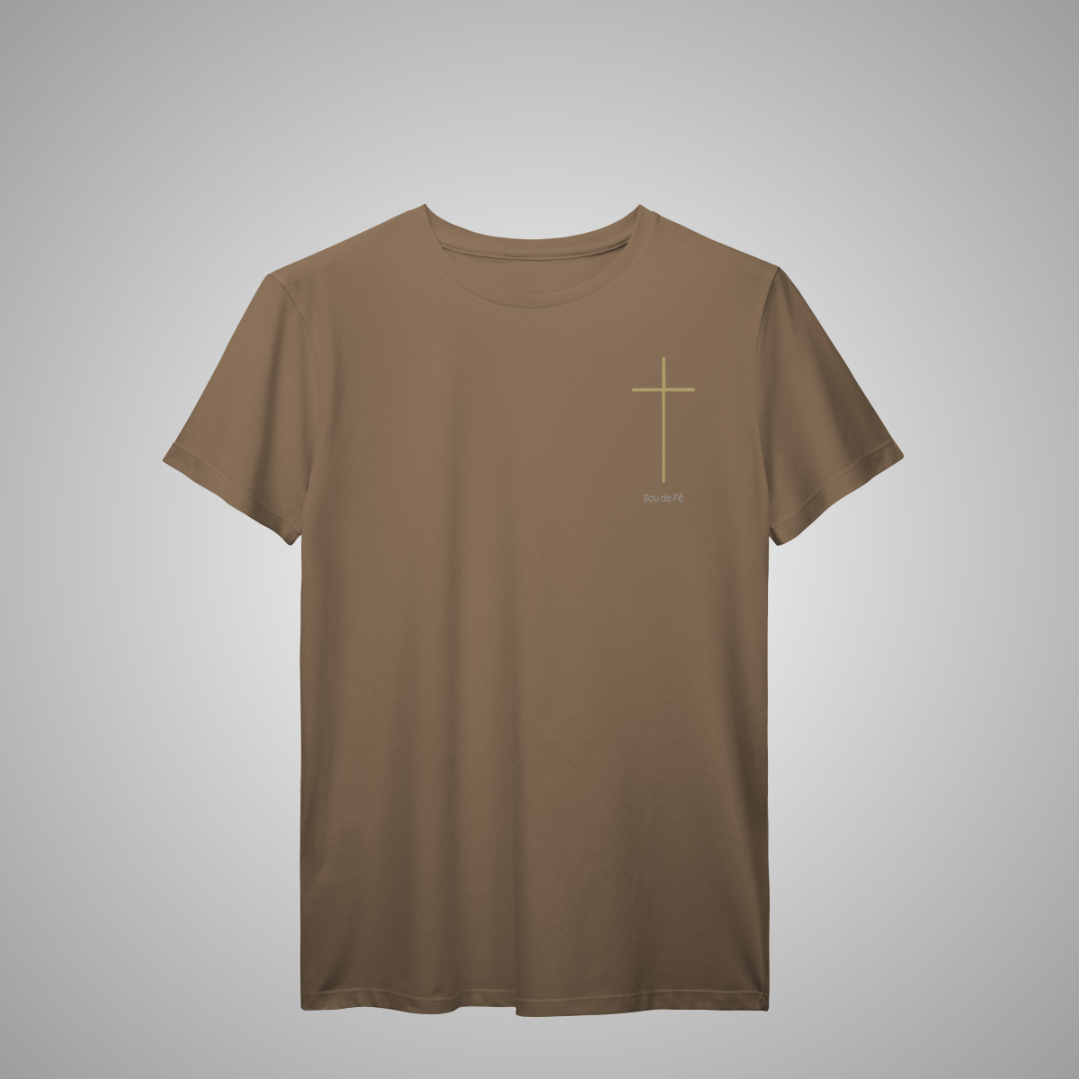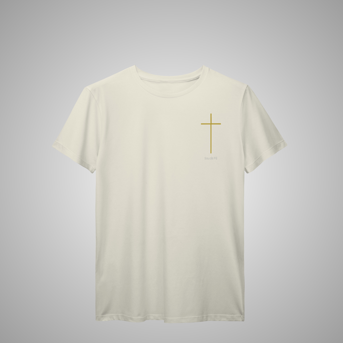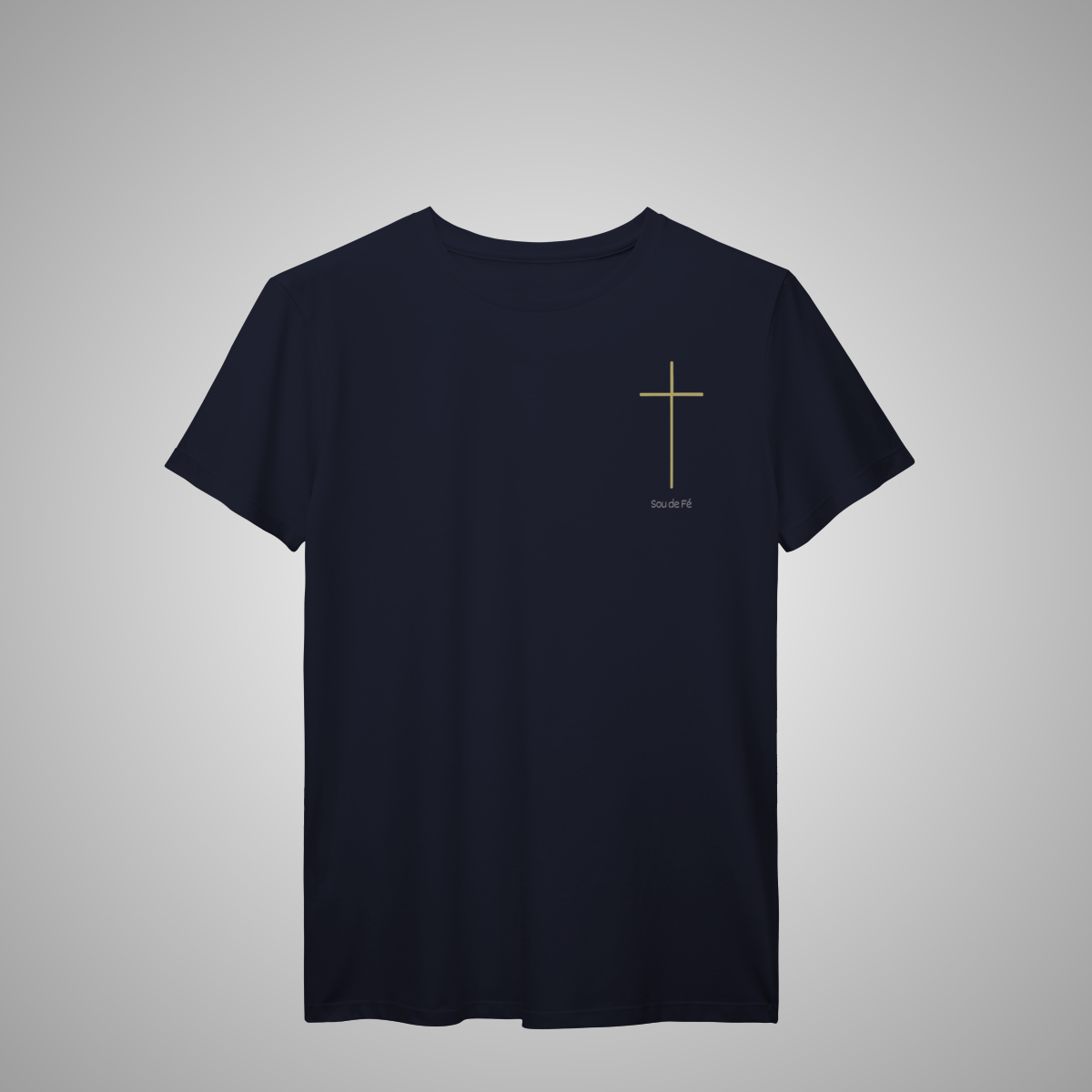 Camiseta masculina, com cruz minimalista dourada aplicada no lado esquerdo do peito. Um design essencial da Sou de Fé, que expressa fé com sobriedade e estilo atemporal.