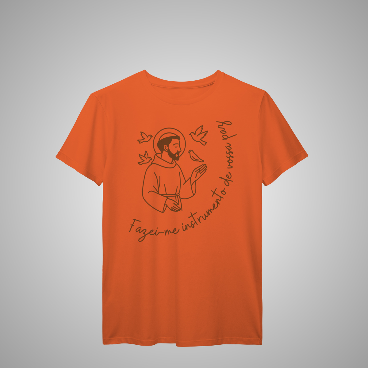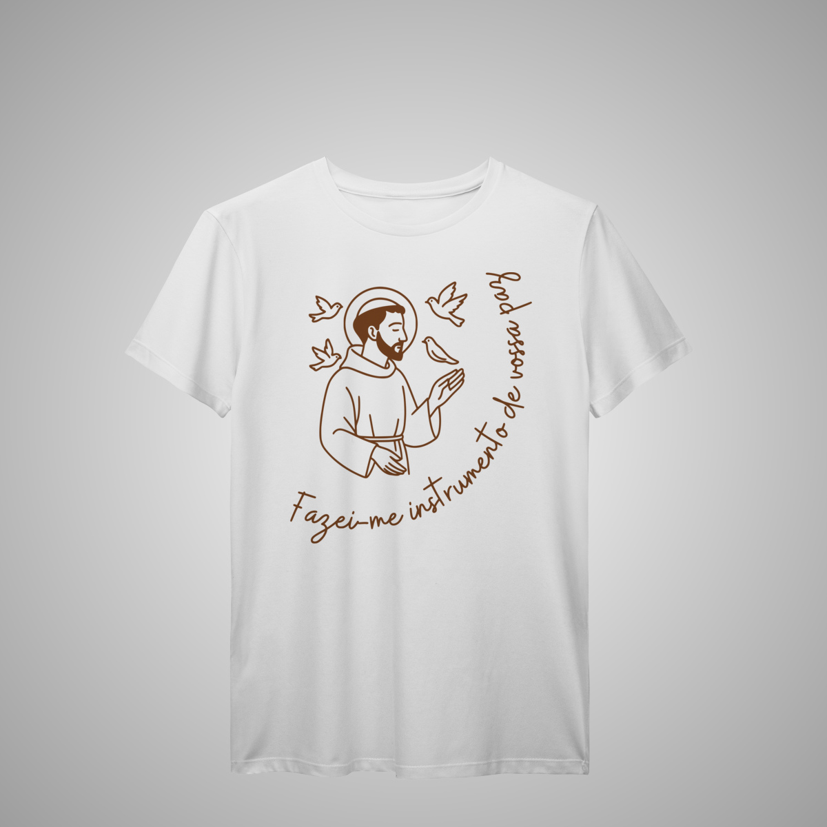 Inspirada na espiritualidade franciscana, esta estampa minimalista traz São Francisco de Assis cercado por pássaros, com a frase “Fazei-me instrumento de vossa paz” contornando suavemente a imagem. Um design discreto, mas cheio de significado — ideal para quem busca vestir propósito, fé e leveza no dia a dia.