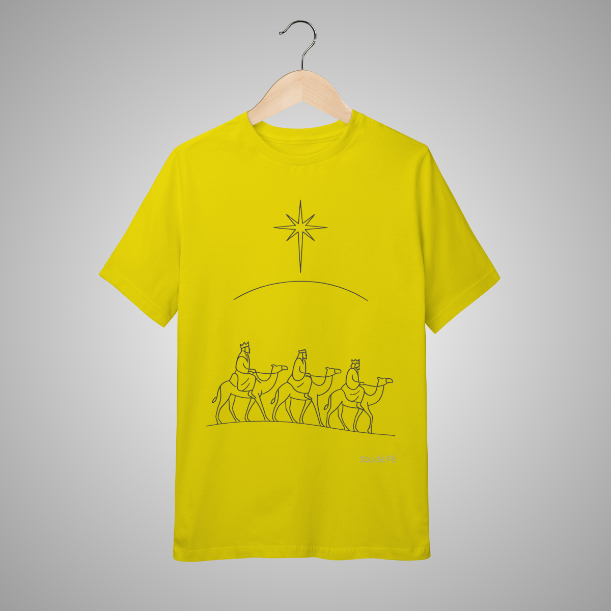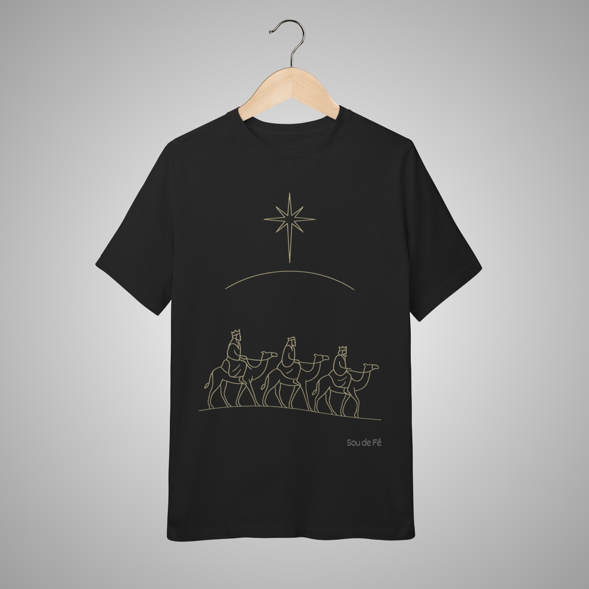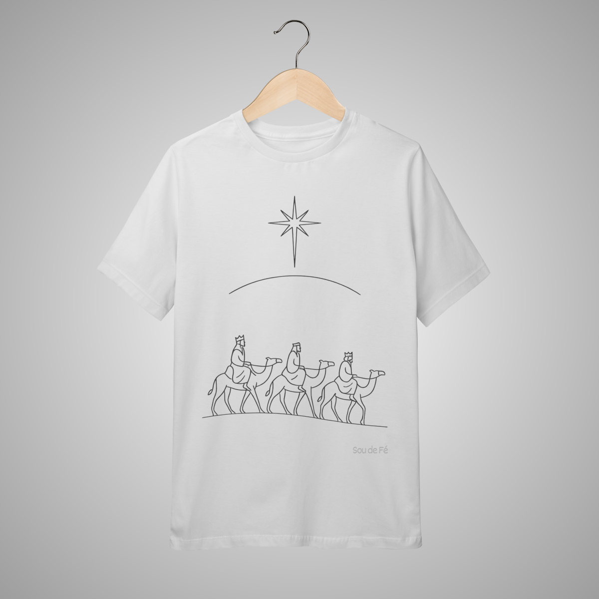 Fé, luz e alegria para o Natal das crianças. A T-Shirt Três Reis Magos traz o caminho dos Reis guiados pela Estrela de Belém — símbolo de esperança e adoração. Um design delicado e minimalista que celebra o nascimento de Jesus com doçura e propósito.