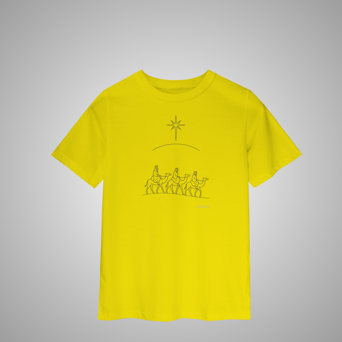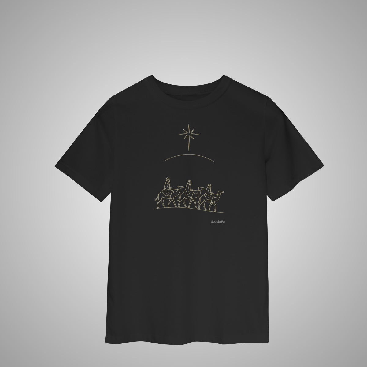 Fé, luz e alegria para o Natal das crianças. A T-Shirt infantil Três Reis Magos traz o caminho dos Reis guiados pela Estrela de Belém — símbolo de esperança e adoração. Um design delicado e minimalista que celebra o nascimento de Jesus com doçura e propósito.