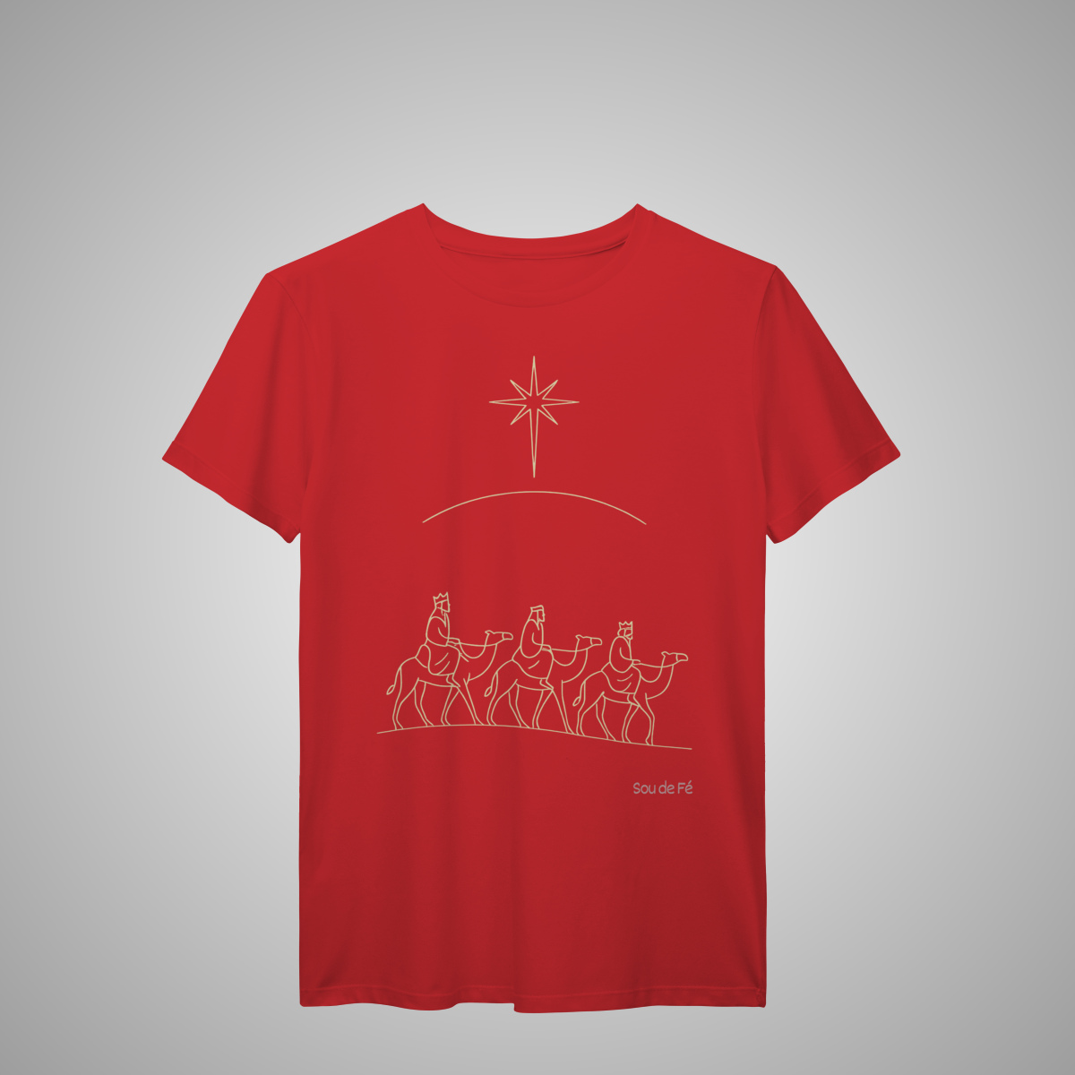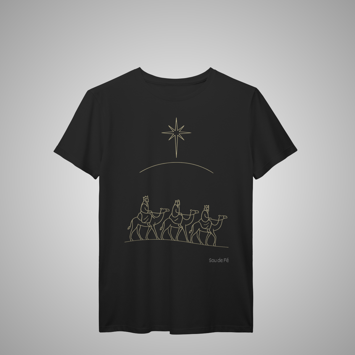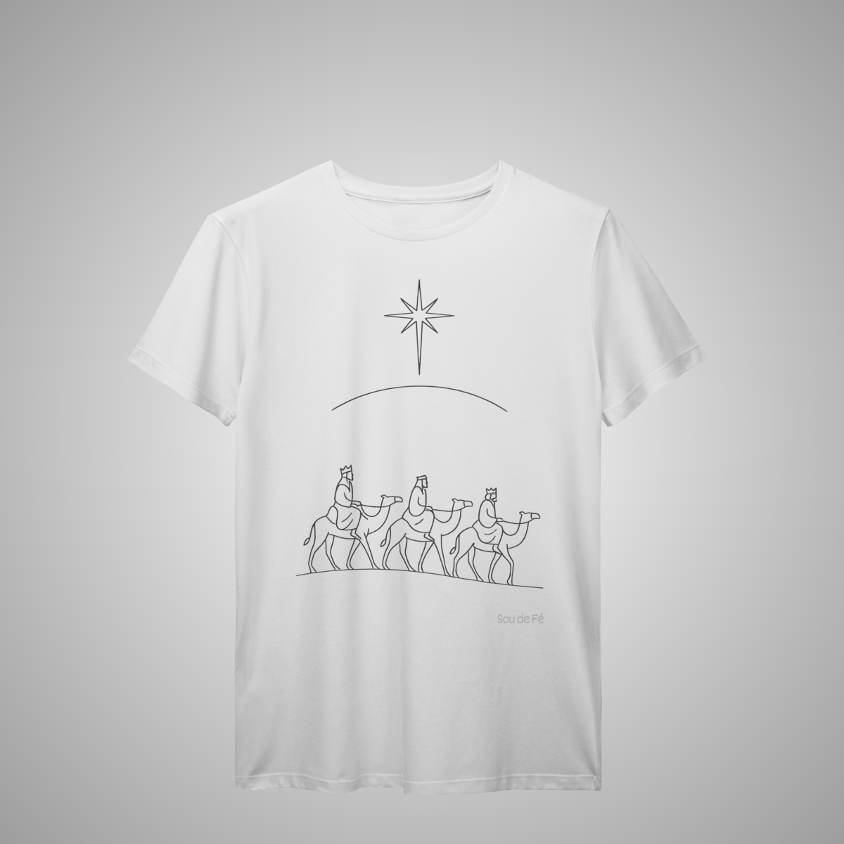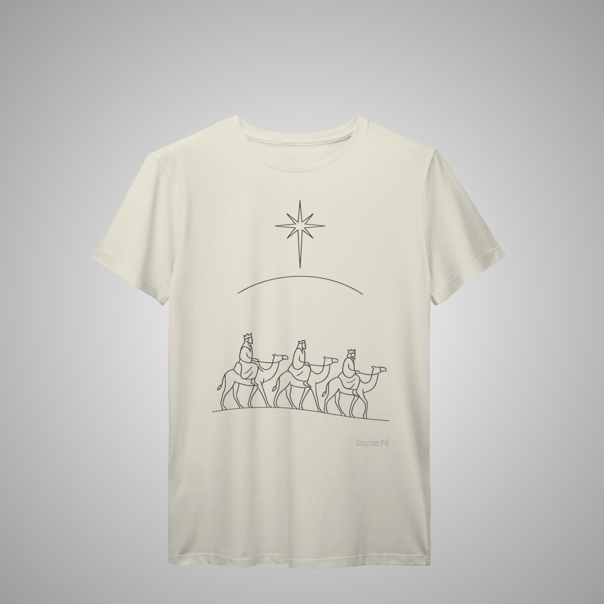 Fé que guia e ilumina. A T-Shirt masculina Três Reis Magos, da Coleção de Natal, celebra a jornada dos Reis guiados pela Estrela de Belém — símbolo de esperança, devoção e propósito. Um design minimalista e atemporal para expressar o verdadeiro espírito do Natal com estilo e significado.